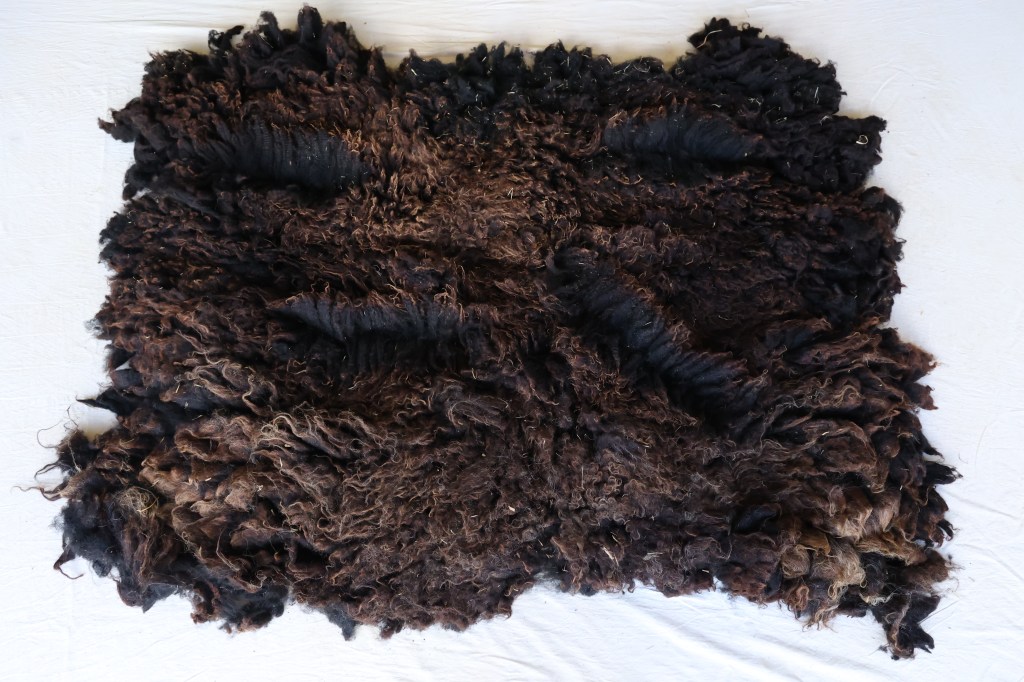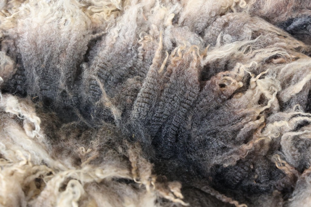 Pictured here is one of our remarkable Shetland wool fleeces. Our sweet Lucy produced this Unique wool that is one of a kind, with various shades of gray mixed with black and brown. Incredibly soft and fine to the touch with wonderful crimp, makes this fleece ideal for spinning, felting or any creative wool crafts.